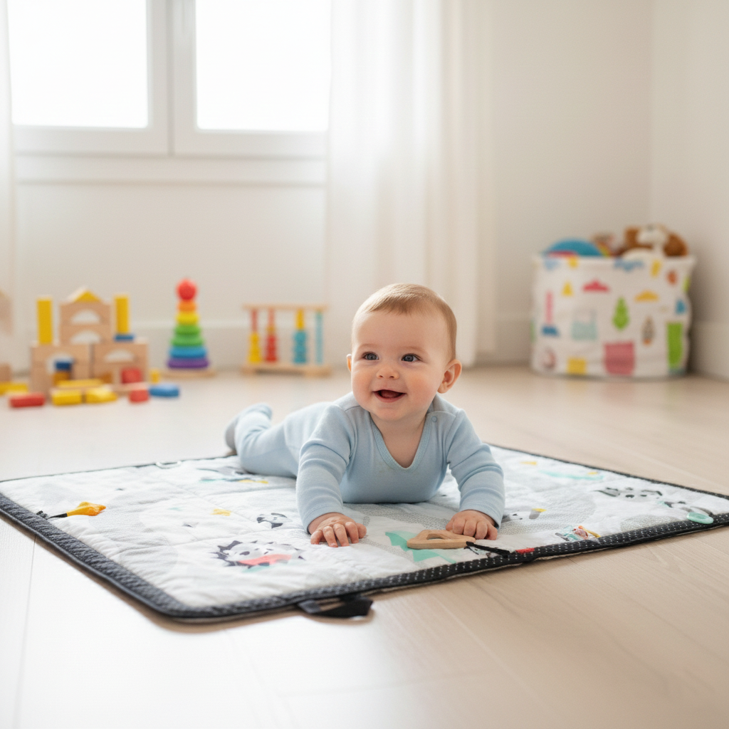 Bébé s’amuse tout en apprenant à lever la tête et à explorer le monde qui l’entoure.