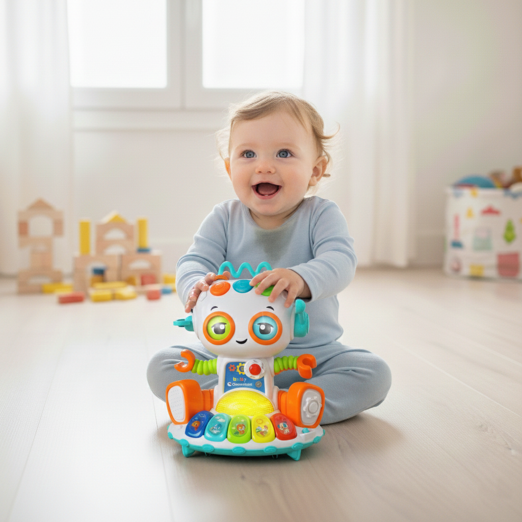 Le Yoko Robot rigolo de Clementoni est un adorable compagnon d’éveil conçu pour stimuler la curiosité et le développement moteur des tout-petits.