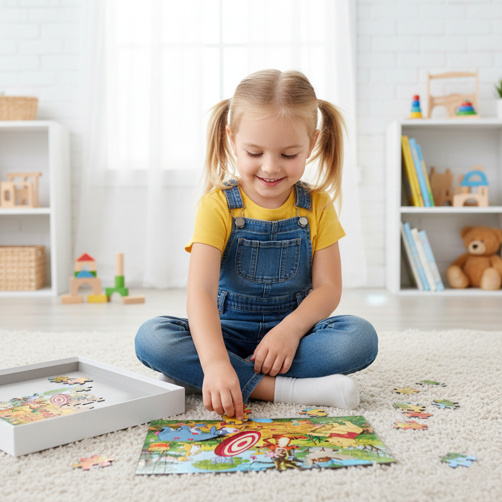 Ce puzzle de 24 pièces plonge l'enfant dans l'univers doux et réconfortant de Winnie l'Ourson et de ses amis (Porcinet, Tigrou, Bourriquet) dans la Forêt des Rêves Bleus. Composé de pièces épaisses et faciles à manipuler, il est conçu pour être à la fois amusant et éducatif pour les jeunes enfants.
