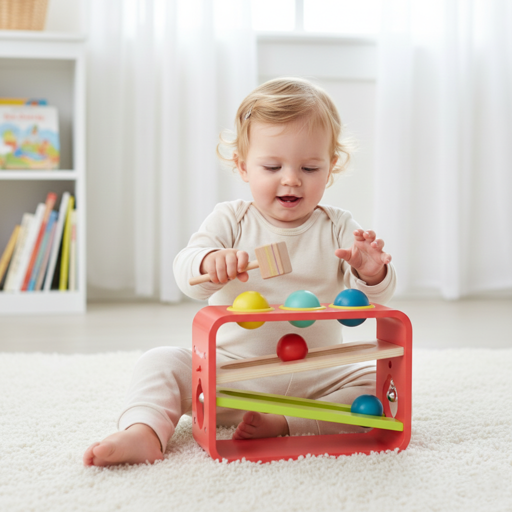 Le Frappa' Ball Tatoo est un jeu de motricité fine et globale sous forme de planches à taper. L'enfant utilise un maillet en bois pour frapper des boules colorées afin de les faire tomber à travers des trous. Ce jeu classique est modernisé par Janod avec des couleurs vives et des illustrations amérindiennes (d'où le nom "Tatoo") qui attirent l'œil. Il est conçu pour encourager l'action, le mouvement et la coordination.