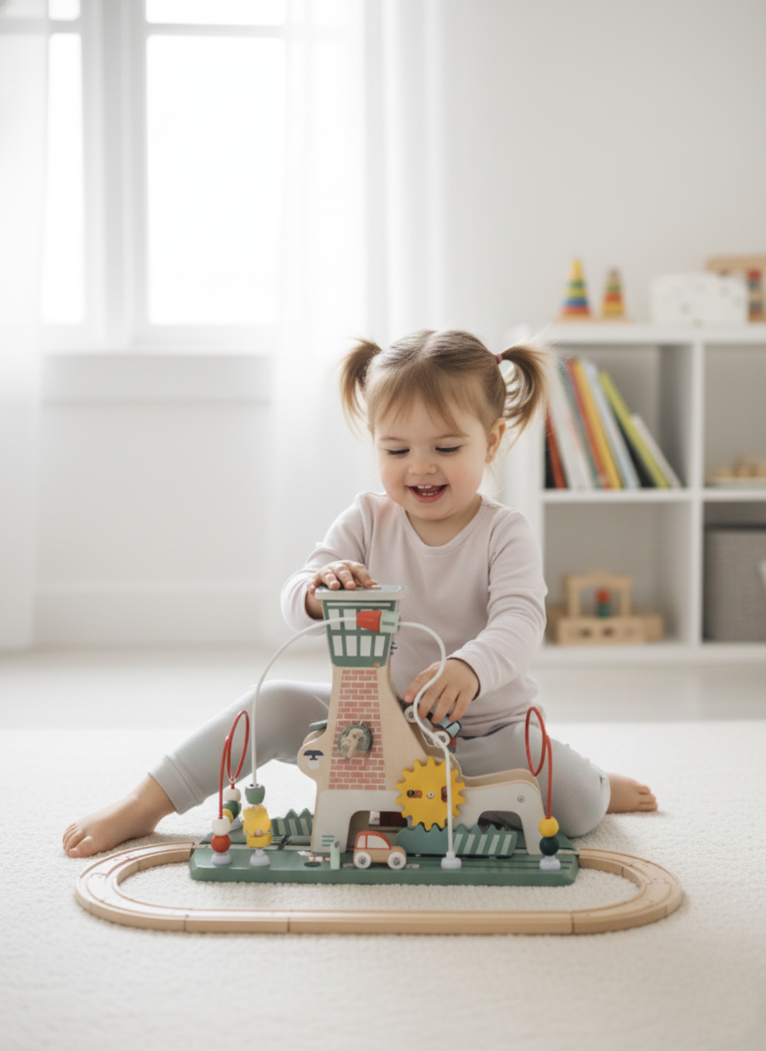 Le principe : l’enfant lance les petites voitures depuis la rampe — celles-ci déroulent les rails, ce qui permet d’imaginer des trajets, des courses ou des aventures. C’est un jeu modulable : on peut combiner la tour + rampe avec d’autres circuits / rails de la gamme pour créer un univers élargi.