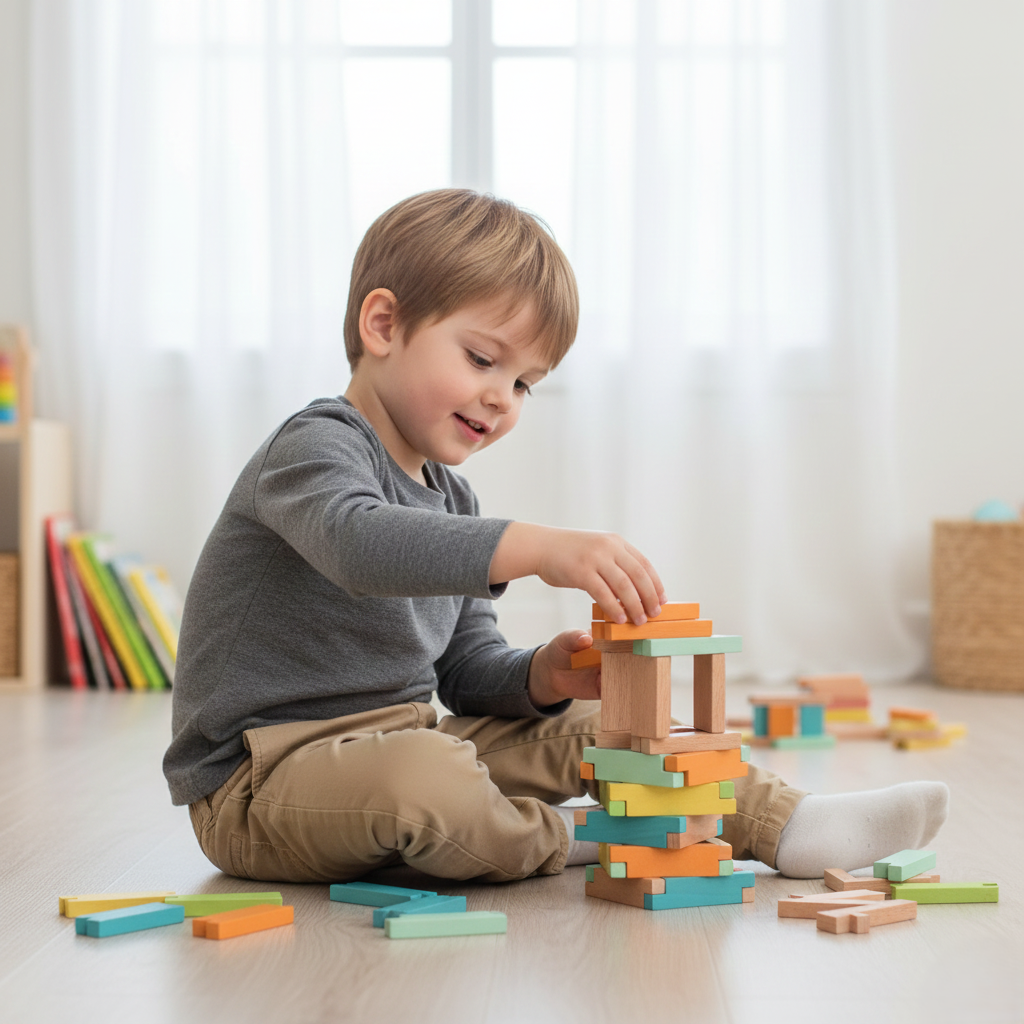 Ce set de construction contient 60 pièces en bois massif (hêtre certifié FSC) de différentes couleurs.