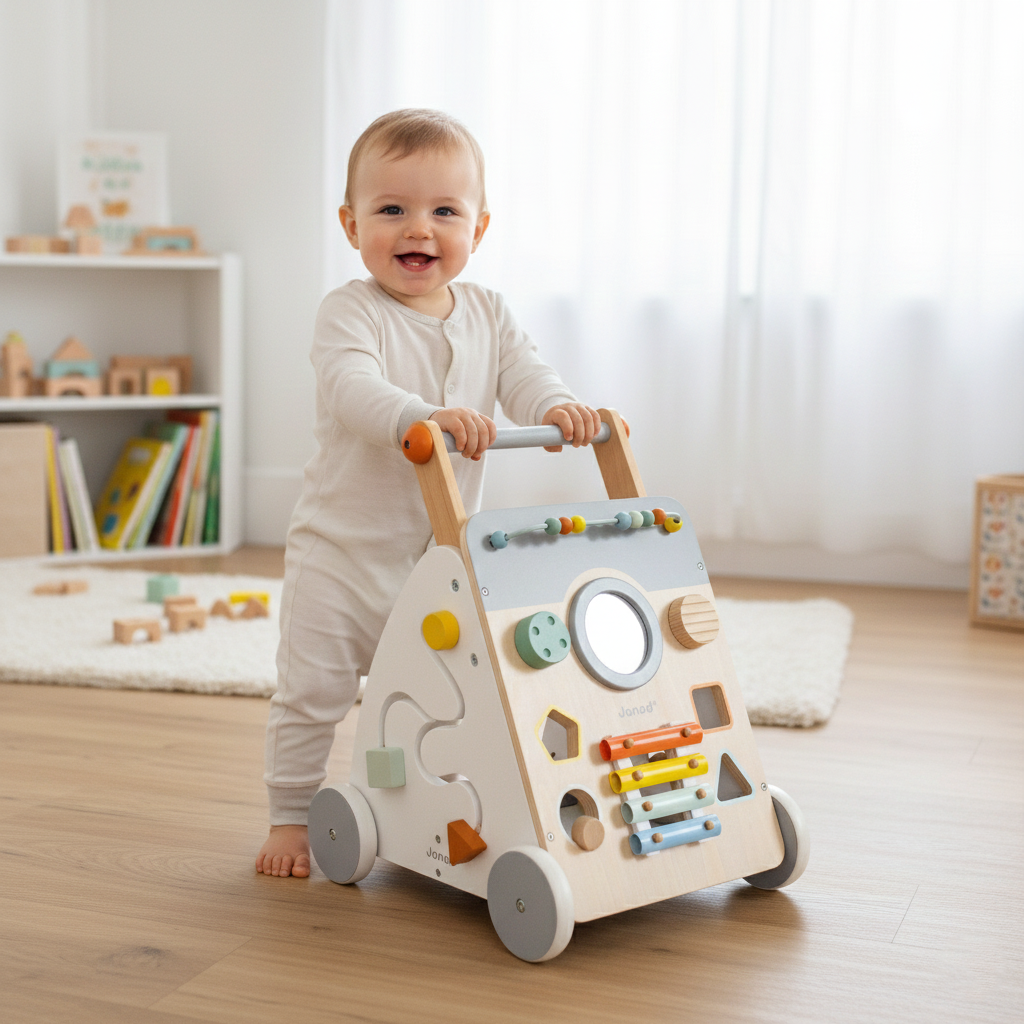 Ce chariot multi-activités à pousser est conçu pour accompagner bébé dans ses premiers pas tout en proposant un jeu riche et évolutif.