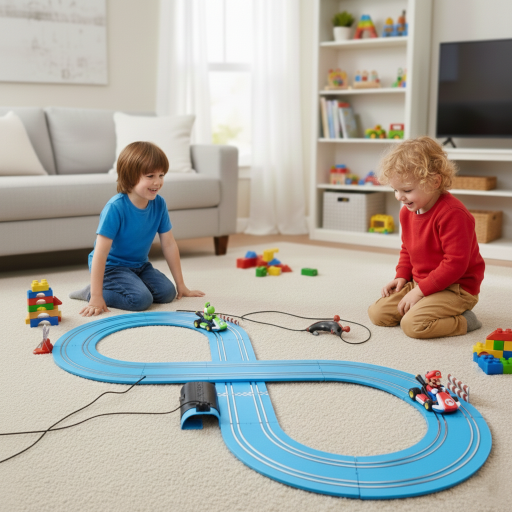 Ce circuit électrique sous licence Mario Kart 8 permet à deux joueurs de s’affronter dans une course rapide : le coffret comprend deux voitures Mario et Luigi à l’échelle 1/43, des rails comprenant boucle (« looping »), courbes, lignes droites, et un système analogique adapté aux enfants. Il offre l’immersion dans l’univers du jeu vidéo Mario Kart, tout en étant un jouet physique pour intérieur.