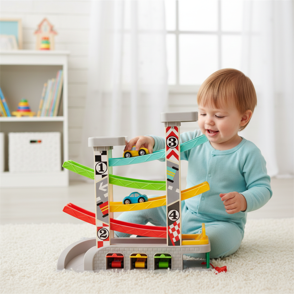 Circuit "autoroute" en bois de la marque Bino, comprenant 3 petites voitures colorées. Le circuit est composé de différentes pentes/basculements sur lesquels on place une voiture en haut, et on la voit descendre tout le long. Le bois massif est de bonne qualité, les couleurs sont non-nocives, et le jouet est pensé pour stimuler la coordination œil-main et la motricité fine.