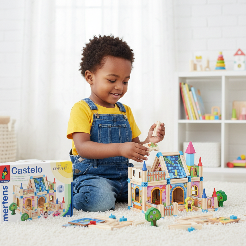 Il s’agit d’un jeu de construction en bois coloré, comprenant de nombreuses pièces permettant aux enfants de construire diverses structures, stimuler leur imagination, et développer la pensée logique. Le design inclut des contrastes de couleurs pour un attrait visuel.