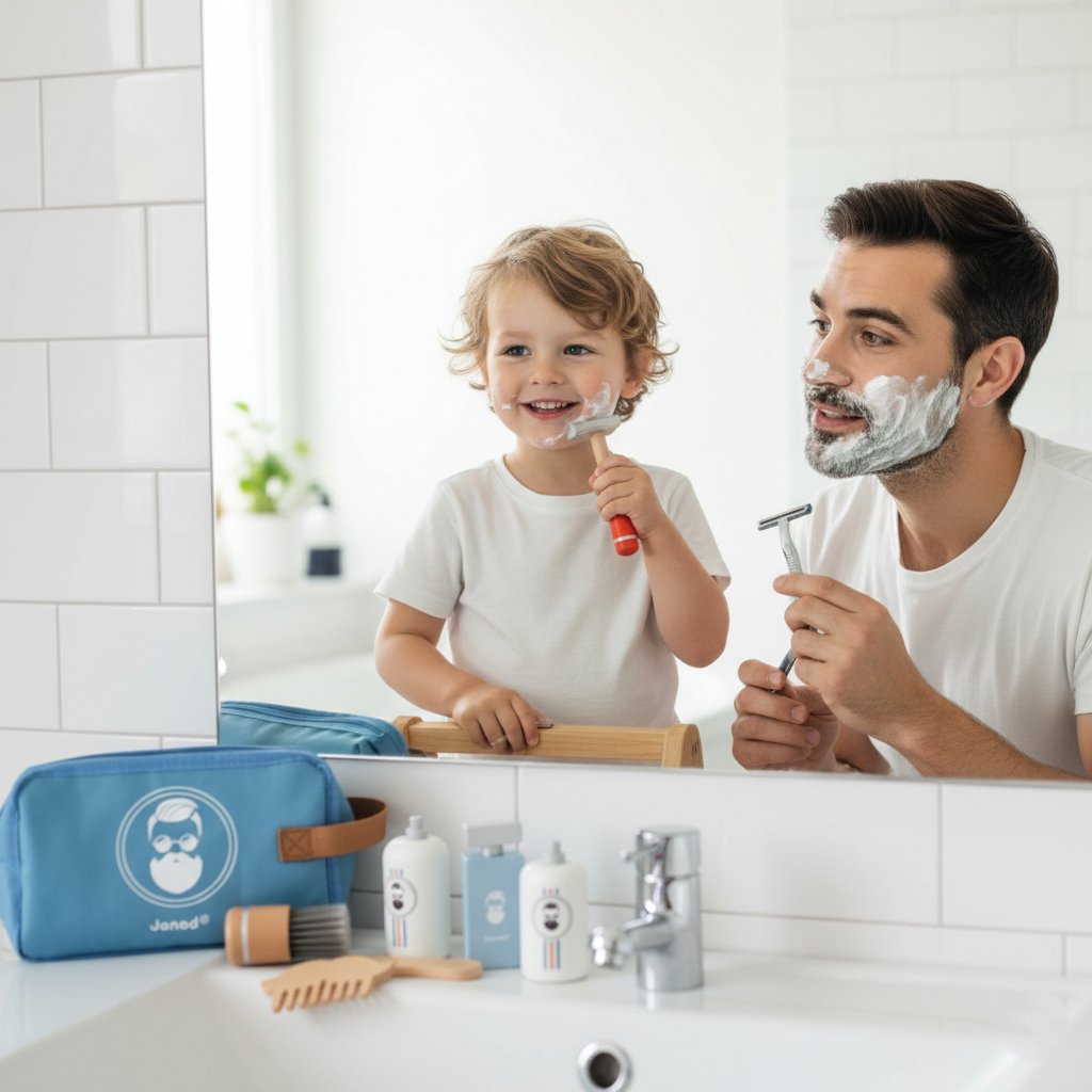 Cette mallette permet aux enfants de se prendre pour un barbier : elle contient 7 accessoires en bois : un blaireau + mousse à raser, un rasoir, un peigne, des ciseaux, un miroir et un flacon de parfum. Tous les éléments se rangent dans une sacoche (zip + poignées en tissu) pour faciliter le transport et le rangement.