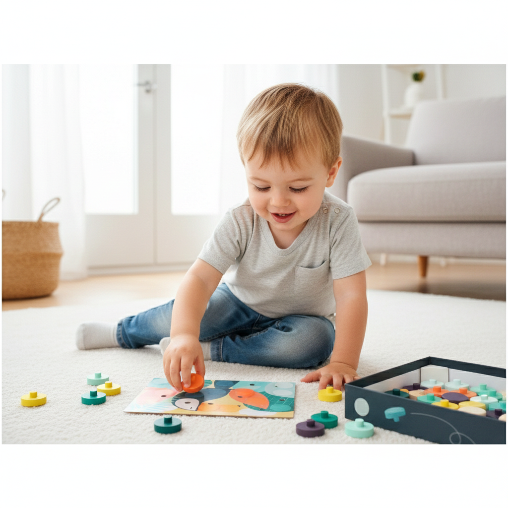 • Objectif : manipuler et encastrer les gros pions bois dans les trous des cartes, ce qui stimule la motricité fine et l’apprentissage des couleurs.