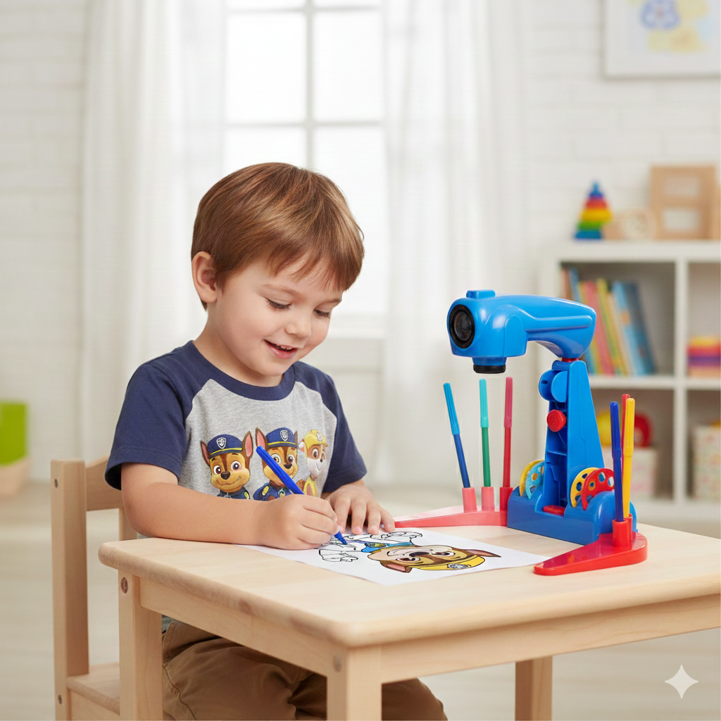 Son fonctionnement est simple : l'enfant doit insérer l'un des disques inclus dans le projecteur, choisir le dessin qu'il souhaite reproduire, puis l'appareil projette l'image sur une feuille de papier. L'enfant n'a plus qu'à suivre les lignes pour dessiner l'image et ensuite la colorier.