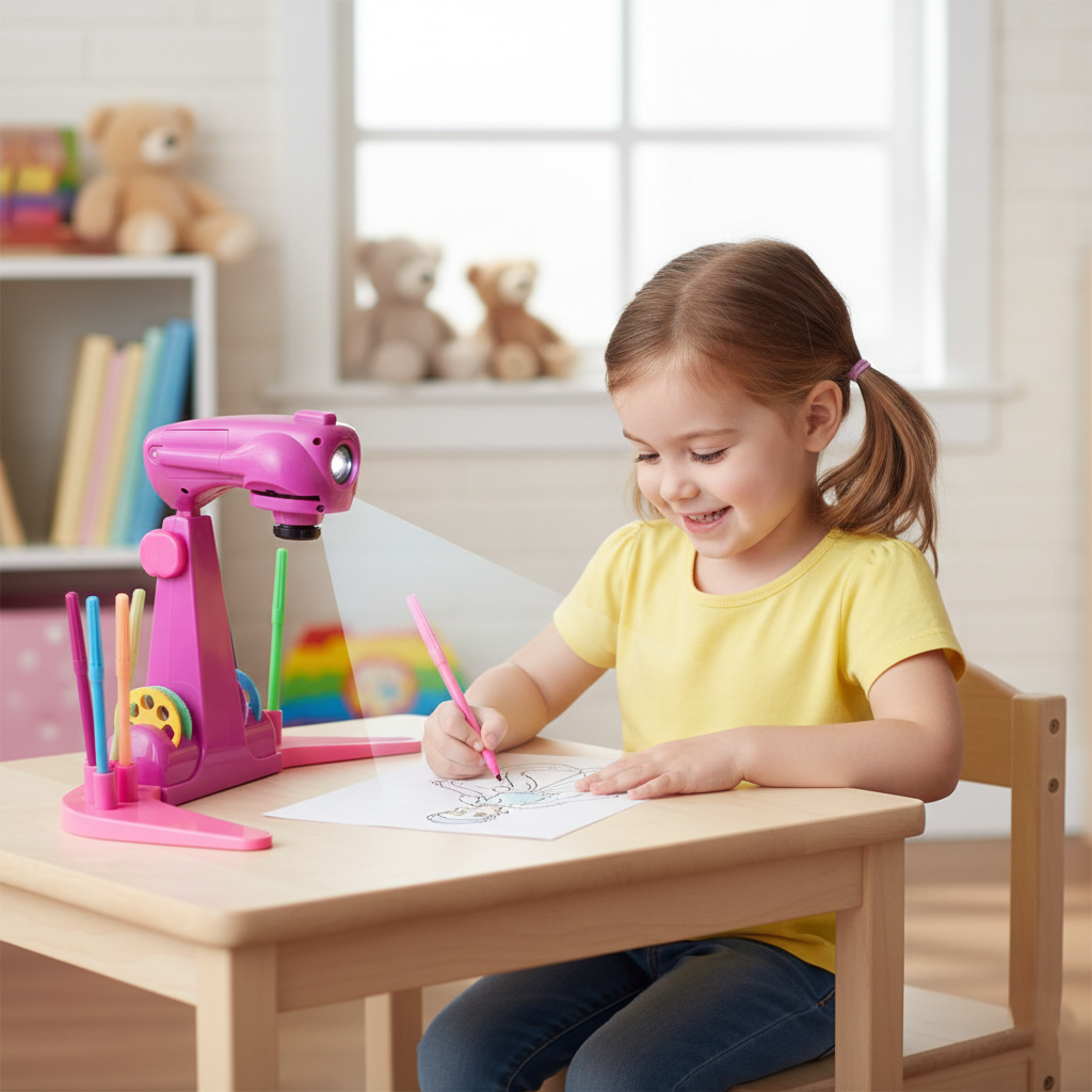 Son fonctionnement est simple : l'enfant doit insérer l'un des disques inclus dans le projecteur, choisir le dessin qu'il souhaite reproduire, puis l'appareil projette l'image sur une feuille de papier. L'enfant n'a plus qu'à suivre les lignes pour dessiner l'image et ensuite la colorier.