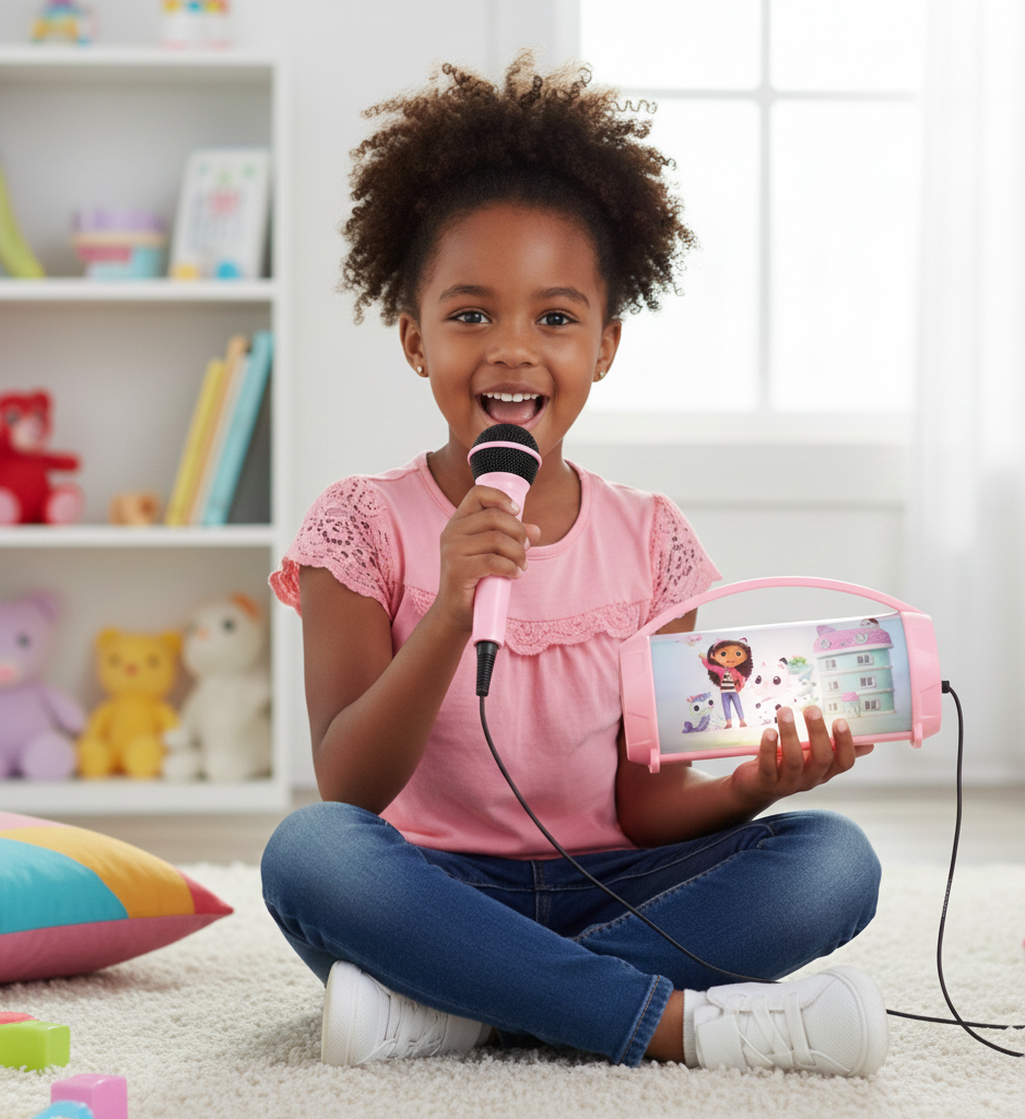 Il s'agit d'une enceinte portable compacte aux couleurs de Gabby et la Maison Magique, conçue pour écouter de la musique et chanter.