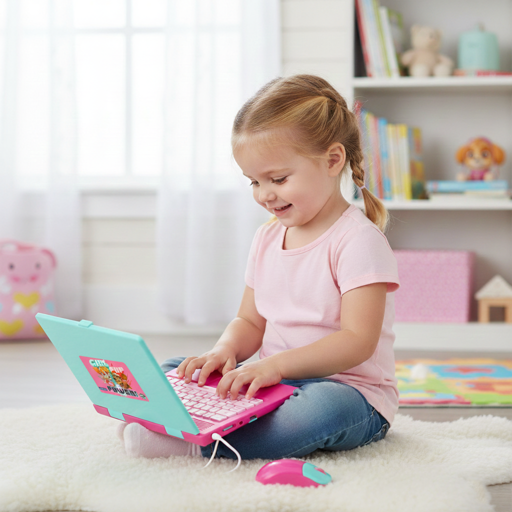 Il s'agit d'un ordinateur portable éducatif de couleur rose, à l'effigie des personnages de la Pat'Patrouille. Il est conçu pour l'apprentissage précoce à travers diverses activités ludiques.