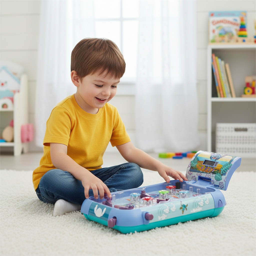 Il s'agit d'un flipper électronique de table, compact, conçu pour jouer à la maison. Il est entièrement décoré aux couleurs de Stitch.