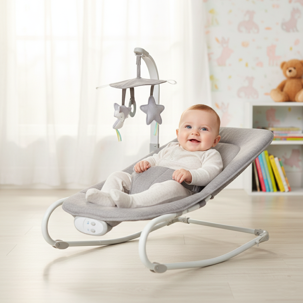 Ce transat-balancelle 2-en-1 combine un siège confortable pour nouveau-né + fonction de bercement avec musique et vibration — idéal pour apaiser ou aider bébé à s’endormir. Il peut aussi servir de transat “simple” selon les besoins, et l’arche de jeu avec jouets suspendus participe à la stimulation sensorielle de l’enfant.