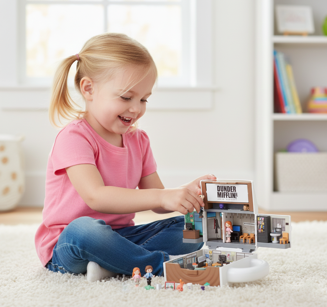Il comprend aussi 9 accessoires liés à la série : citrouille (piège de Dwight), bandana de Michael (“Prison Mike”), pot de chili (Kevin), feu de poubelle, “Dundie Awards”, etc. Il y a 6 décors miniatures à l’intérieur : bureaux, salle de pause, salle de réunion… pour recréer des scènes du bureau de Dunder Mifflin.