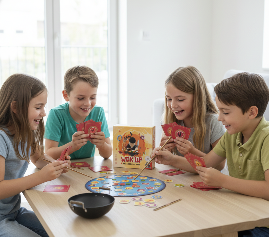 Mécanique de jeu : les joueurs lancent simultanément leurs jetons ingrédient pour les faire tourner et qu’ils retombent dans le wok.