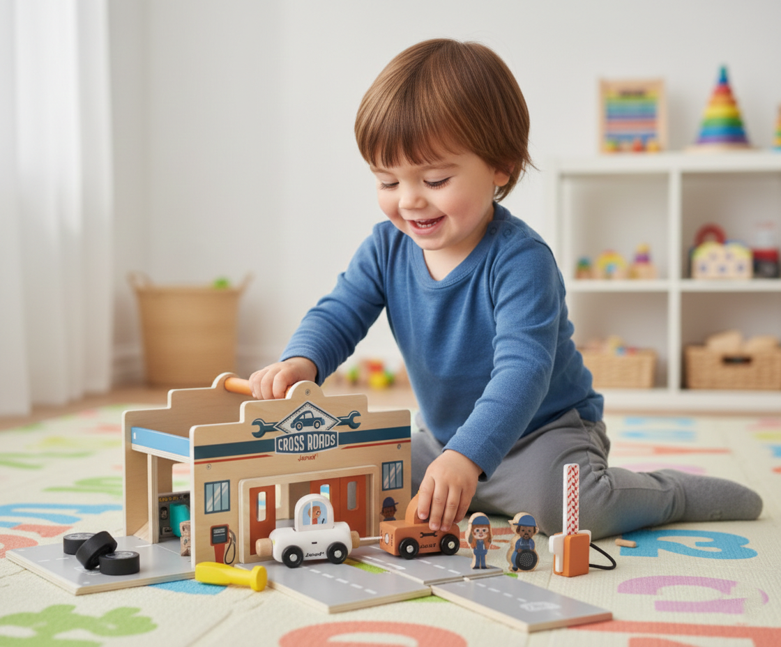Ce garage en bois nomade est conçu pour les petits mécanos dès 2 ans. Très complet, il propose un univers de jeu réaliste avec une station de lavage (rouleaux en mousse), un parking à l'étage accessible via une rampe, et un atelier de réparation. Le garage est doté d'une poignée de transport et se referme pour servir de boîte de rangement pour tous ses accessoires. Il comporte des portes coulissantes et des accès aimantés facilitant le jeu. Ce modèle fait partie de la collection Cross Roads, idéale pour être associée aux tapis de jeu de la même gamme.